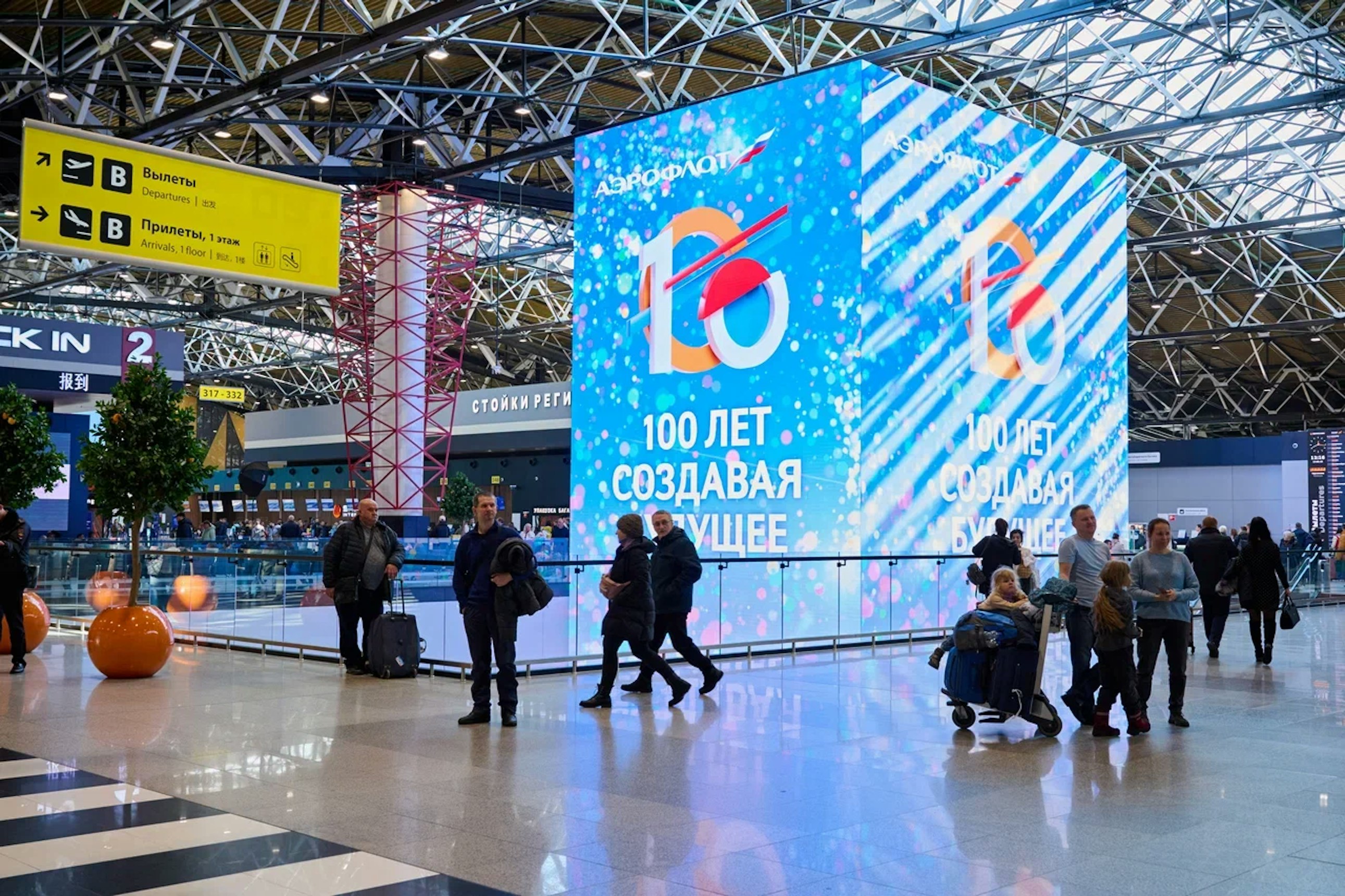 In 2023, Russia’s largest airline, Aeroflot, celebrated its 100th anniversary. We developed the design concept for the anniversary branding, which was featured across airports and on board the aircraft. Here is one of the key visual stages installed at Sheremetyevo Airport — a proud tribute to a century of aviation history and excellence.